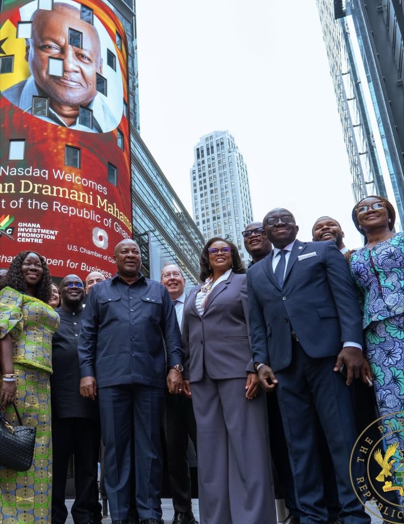 Ghana’s President John Dramani Mahama made a symbolic appearance at the NASDAQ Stock Exchange, where he rang the opening bell