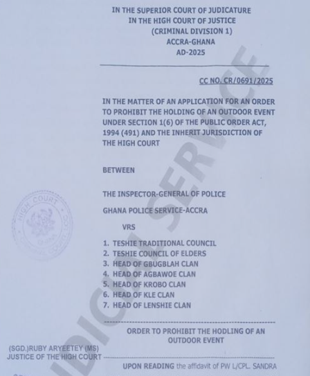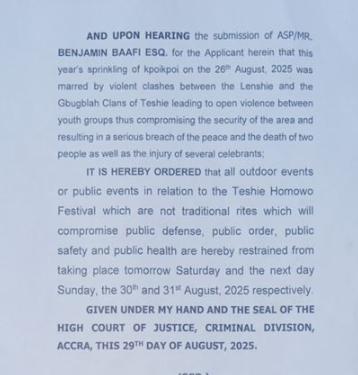 The Accra High Court, Criminal Division, has issued an injunction halting all outdoor and public events for the 2025 Teshie Homowo Festival following violent clashes that marred the celebrations earlier this week.