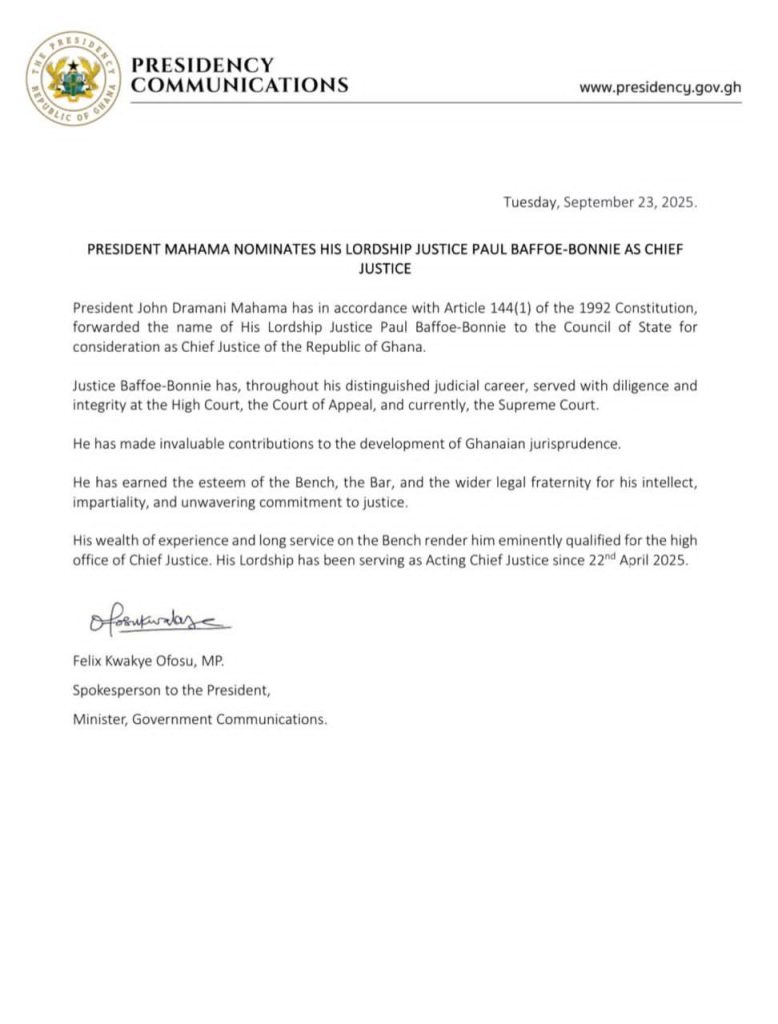 The Ghana Law Society congratulated Justice Baffoe-Bonnie on his nomination and pledged its full support to the judiciary under his stewardship. The leadership of the Society reaffirmed its commitment to collaborate with the Chief Justice in building a more efficient and accessible justice system for all Ghanaians.