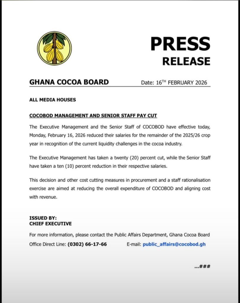 The Ghana Cocoa Board (COCOBOD) has announced salary reductions for its executive management and senior staff as part of urgent measures to address liquidity challenges within Ghana’s cocoa sector.