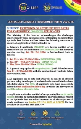 In a public notice, the Ministry acknowledged that a number of Category C applicants holding WASSCE certificates encountered challenges while submitting their aptitude tests online. According to officials, the technical bottleneck affected a segment of candidates and required swift intervention to ensure fairness and transparency in the ongoing 2025/26 security services recruitment exercise.