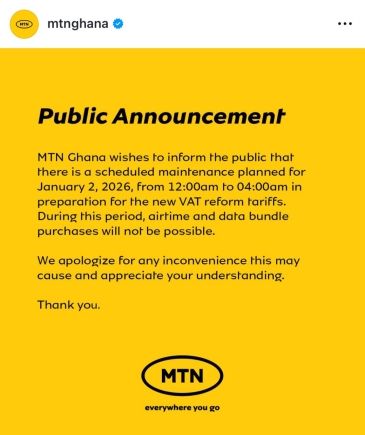 “There is a scheduled maintenance planned for January 2, 2026, from 12:00am to 04:00am in preparation for the new VAT reform tariffs,” MTN Ghana stated.