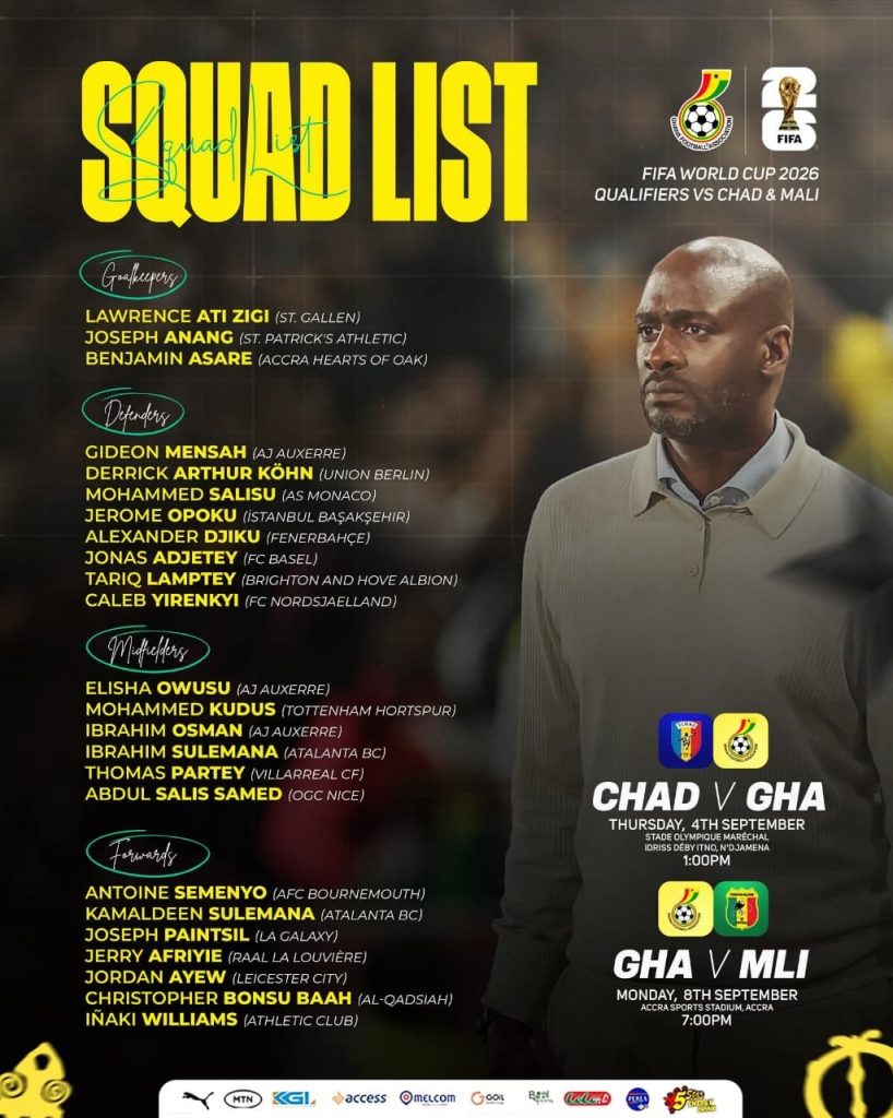 The squad features key regulars such as Thomas Partey, Mohammed Kudus, Jordan Ayew, Gideon Mensah, Antoine Semenyo, and Inaki Williams, while also introducing fresh faces to bolster the team.
